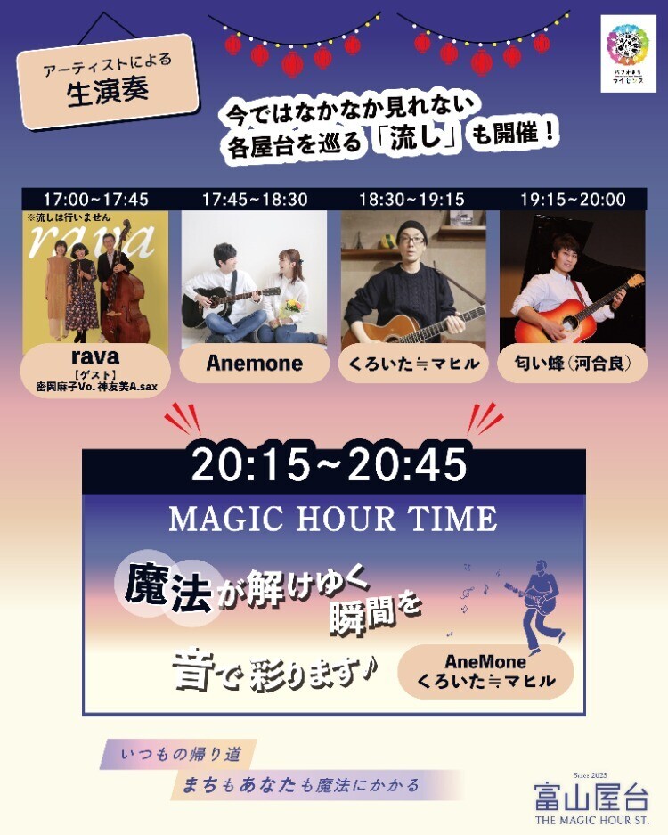 通常MAGIC HOUR(マジックアワー)とは、日の出直後や日没直前の短い時間帯で、柔らかく暖かい光という意味を持っており、本企画には夕暮れの黄昏時から夜にかけての会場全体の移り変わりや、富山駅前の日常の中に、突然出現する屋台群、色々なものが化学反応を起こし『魔法』にかかるような様を名称に込めております。