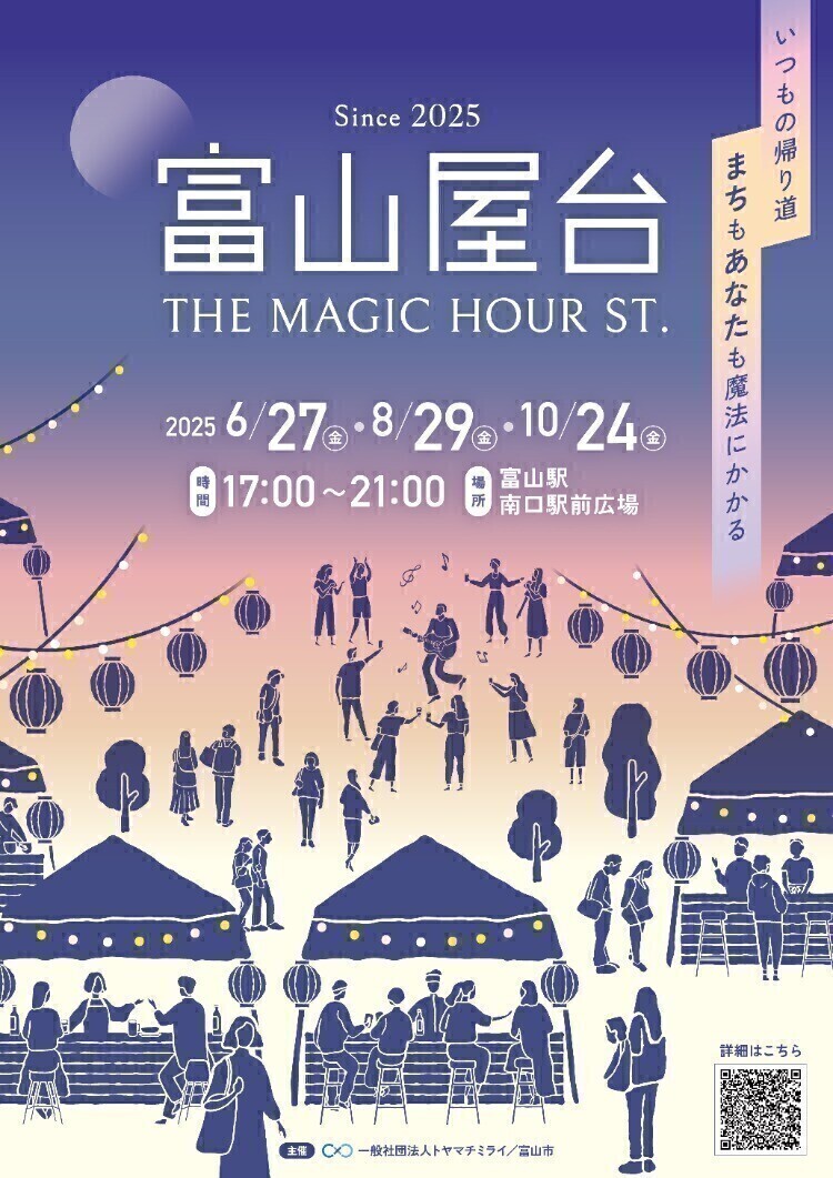 過去に実施していた『ゆうぞら駅市』の後継として、在りそうでなかった富山駅前で様々なジャンルの屋台が集う新たな企画として、年3回限定で実施される本企画は、MAGIC HOURの黄昏時に開催され、様々な方々が交わる富山駅前という場で、移り変わる情景とともに、各々の日常に彩を添えるきかっけの場となるべく、また富山駅前の賑わいを彩る一部としての立ち位置を目指す企画です。