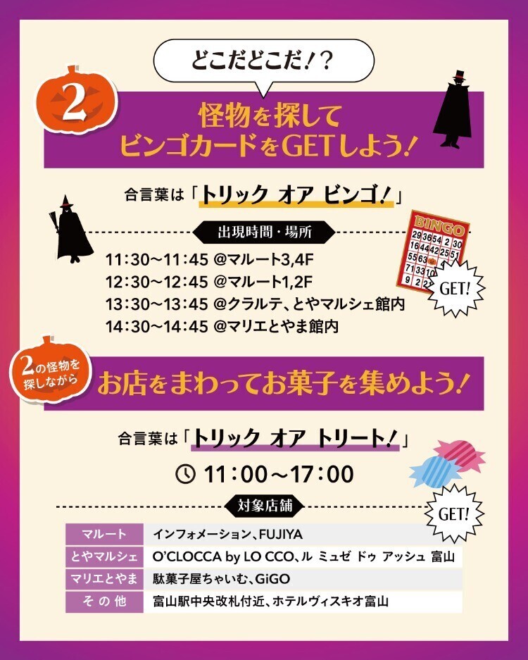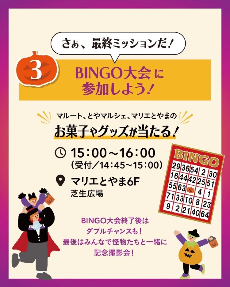 マルート、とやマルシェ、マリエとやまのハロウィンお菓子や素敵なグッズがゲットできる「ビンゴ大会」に挑戦だ!終了後はドキドキのダブルチャンスでさらなる景品を狙っちゃおう!⭐