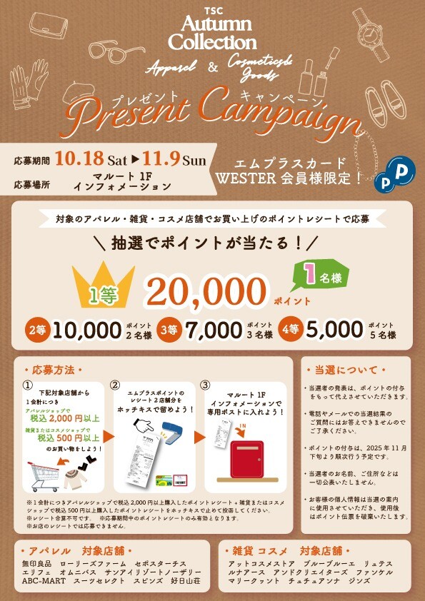 会計時に、必ずエムプラスカードに紐付けされたWESPOまたはWESTERバーコードをご提示ください。応募の際にはポイントレシートが必要となります。