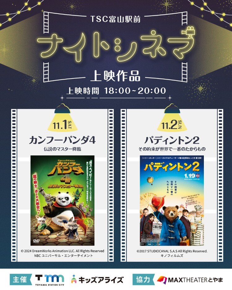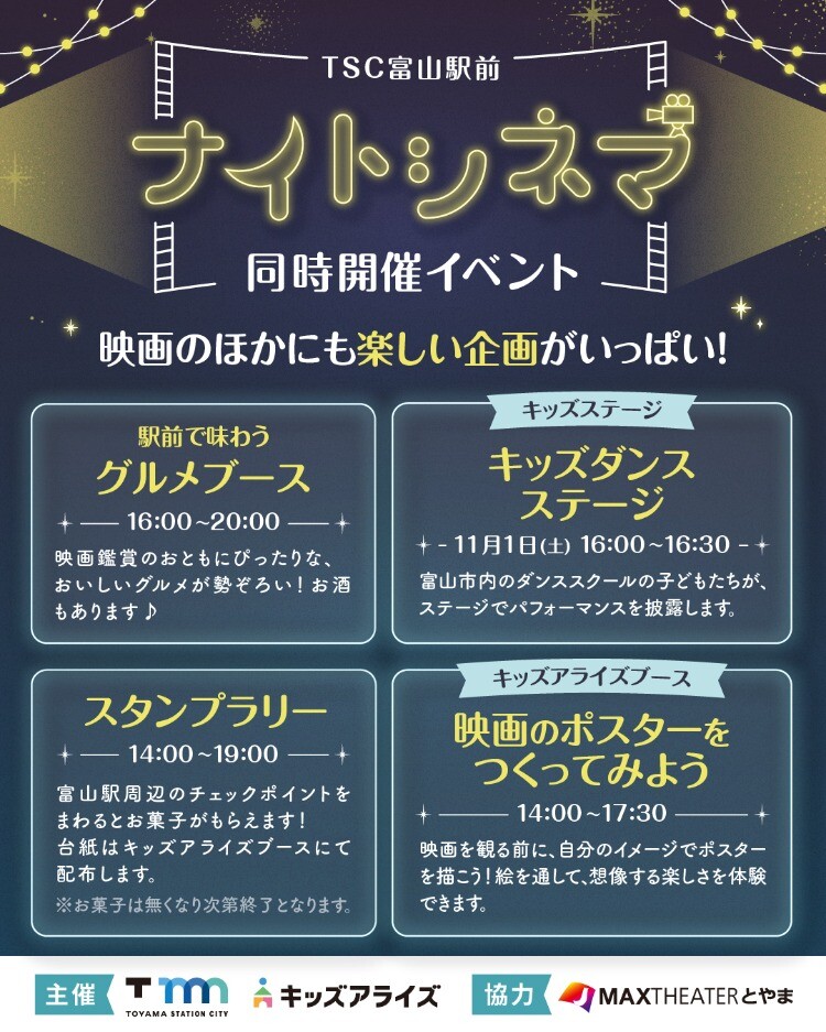 ナイトシネマをもっと楽しんでいただくために、「スタンプラリー」を開催します。マルート、とやマルシェ、マリエとやま館内のチェックポイントをまわっていただくとお菓子をプレゼント!スタンプラリーの台紙は、キッズアライズブースにて配布いたします。