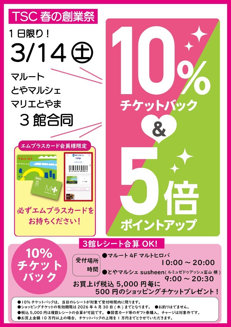 マルート、とやマルシェ、マリエとやまの3館レシート合算OK!
