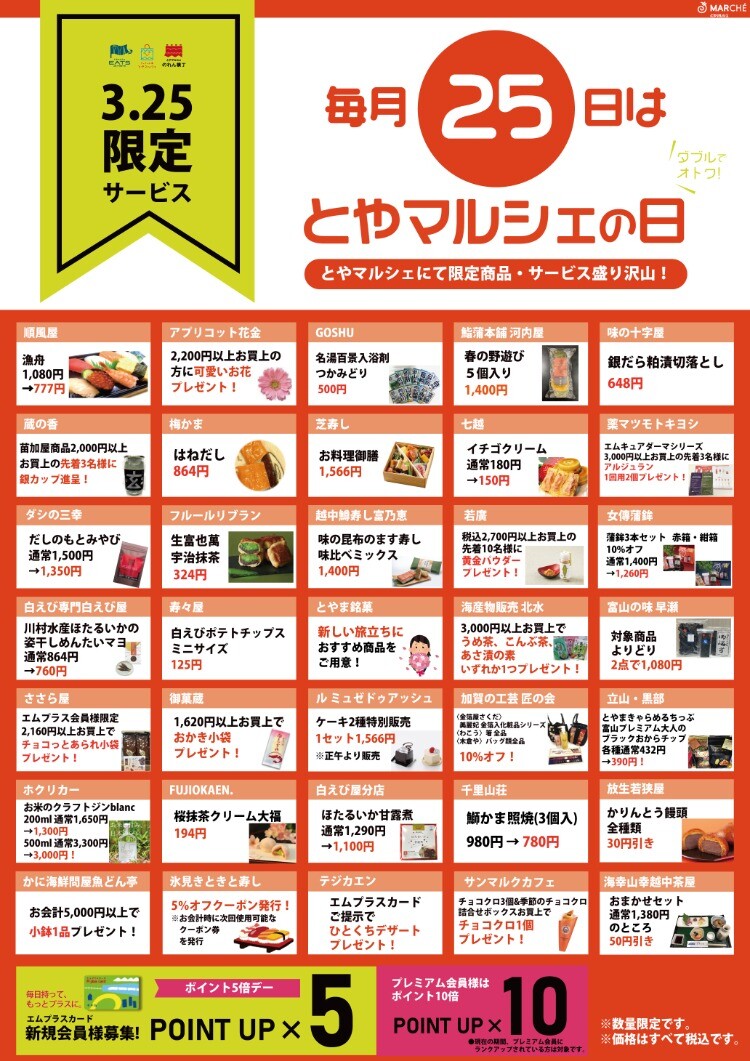毎月25日はエムプラスポイント5倍DAYに加えて、とやマルシェではもっとお得🉐✨