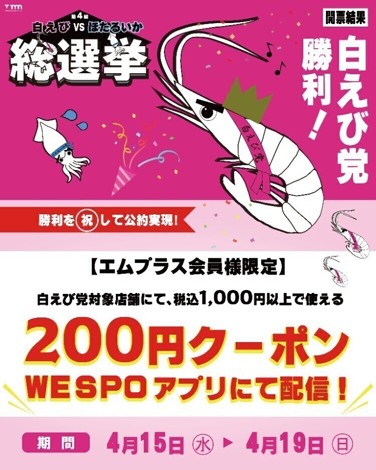 白えび党では勝利を祝してエムプラスカード会員様限定でご利用いただける期間限定WESPOクーポンを配信いたします🎫✨