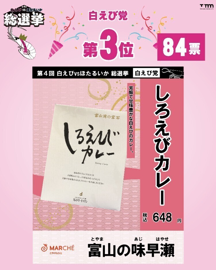 ▶3位 きときと市場とやマルシェ『富山の味早瀬』しろえびカレー(84票)