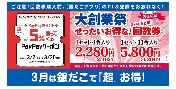 『ぜったいお得な!回数券』 は、全国の築地銀だこ店舗 (*1) でご利用いただける 「お好きなたこ焼(1舟8個入り)」(*2)と引換え可能な大変お得な回数券で、使いやすい4枚セット(2,280円税抜 / 2,462円税込)と、大満足の11枚セット(5,800円税抜 / 6,264円税込)の2種類をご用意しております☺️