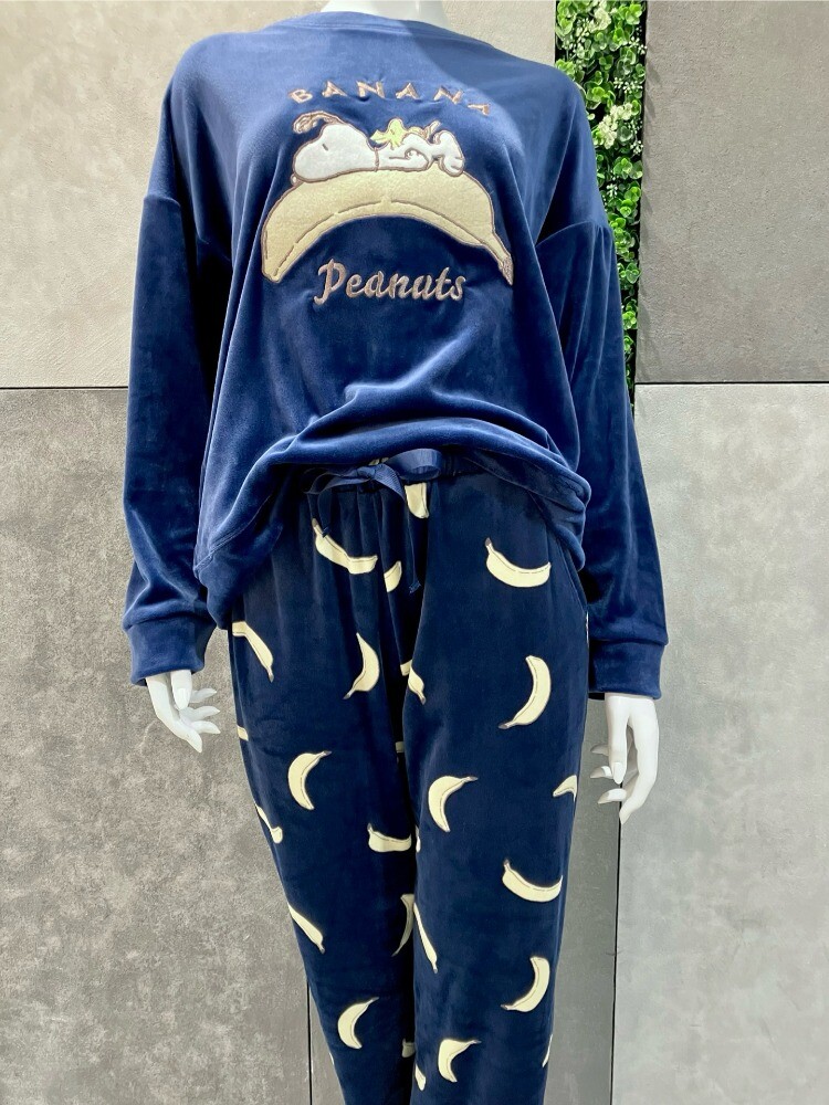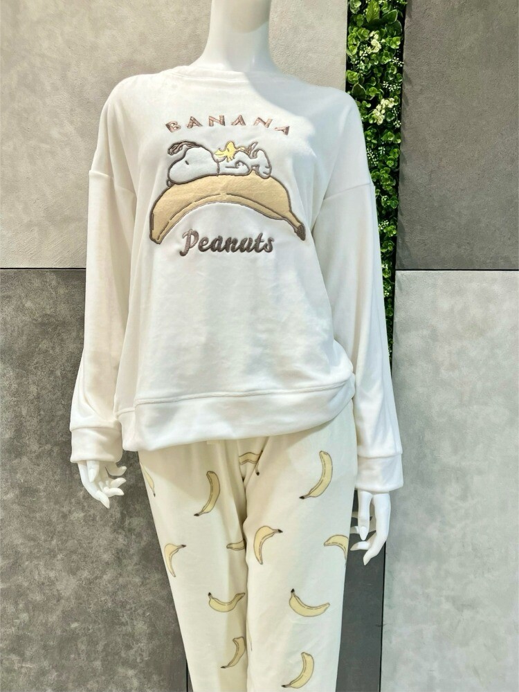 かわいいスヌーピーのアップリケをトップスに、ボトムはばななの総柄デザインです。