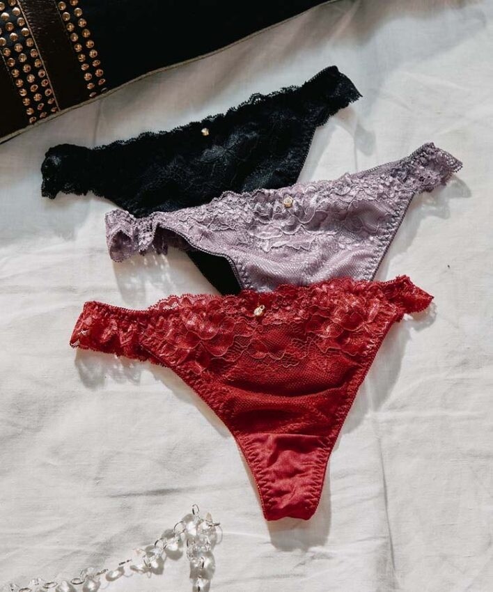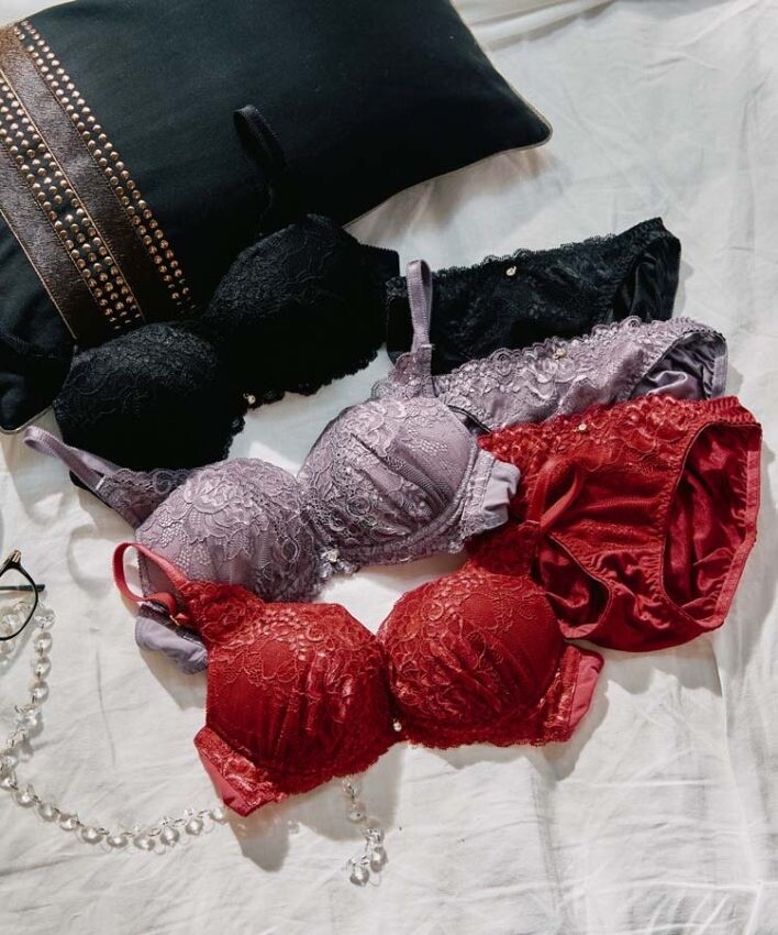 ストレッチ素材のレースが谷間でクロスしているデザイン、ストラップを引き上げるパターンと相まって