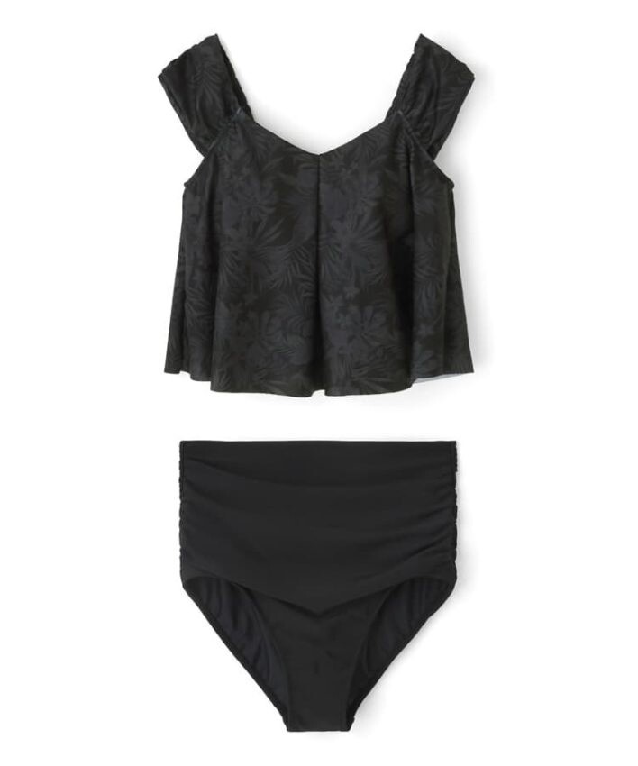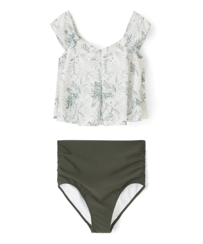 大人っぽい落ち着いたリーフプリントがポイントのワンピース風セパレート水着。