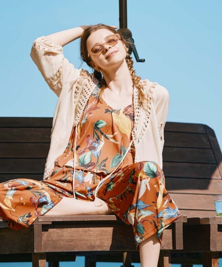 ビーチに映える大胆なボタニカル柄のタンキニとロングパンツのセットアップ。
